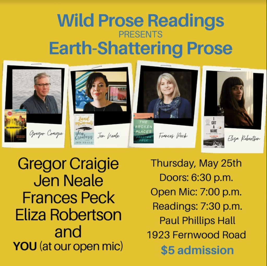 Come join me for a reading with Gregor Craigie, Frances Peck and Eliza Robertson for a night of “earth-shattering prose”. I’m going to read from a novel in progress, which I’m excited to share for the first time.